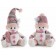 Delizioso set di due pupazzi di neve in morbido peluche color bianco e rosa, decorati con cappello e sciarpa in maglia dal motivo invernale.